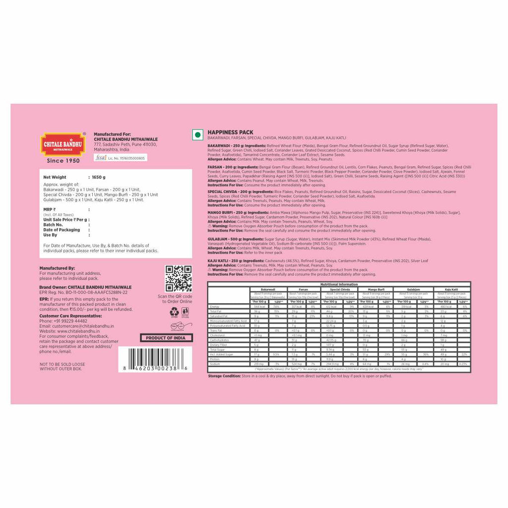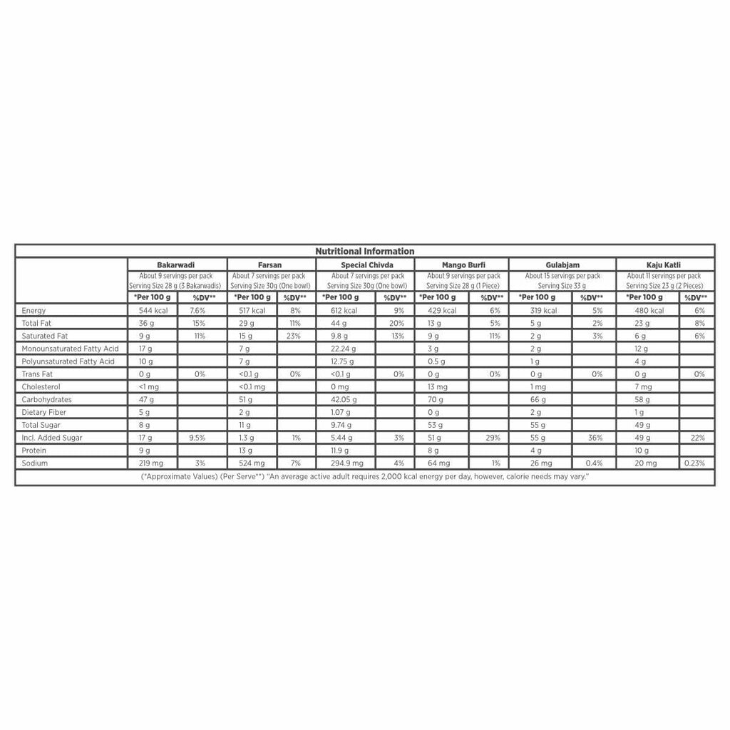 SHELF LIFE: 60 DaysMRP (incl. GST): Rs. 1100/-PACK CONTAINS:Mango Burfi 250 g, Kaju Katli 250 g, Farsan 200 g, Special Chivda 200 g,Bakarwadi 250 g, Gulabjam 500 g
